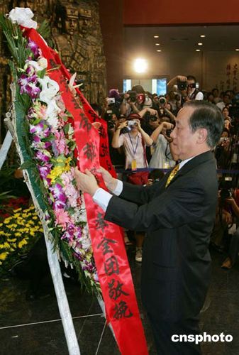 臺灣新黨主席郁慕明率領的臺灣新黨“民族之旅”訪問團七月十一日在北京盧溝橋參觀中國人民抗日戰爭紀念館并敬獻花圈。作者:毛建軍