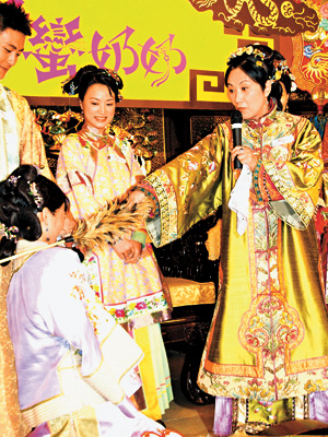 中新網(wǎng)7月13日電 據(jù)香港《大公報》報道,“無線”將于下周一推出新劇《我的野蠻奶奶》,昨日一班演員包括汪明荃、胡杏兒、黃宗澤及伍詠薇等,特地穿上清裝到珍寶海鮮舫舉行“新抱入門儀式”宣傳活動。期間“阿姐”、杏兒及Bosco(黃宗澤)除了Rap唱主題曲之外,“阿姐”更如野蠻奶奶“上身”般,向杏兒訓(xùn)示媳婦入門家規(guī)時喝令她跪下,之后送杏兒繡花鞋、樹葉及雞毛掃,“阿姐”道:“送樹葉是希望你開枝散葉,我看你晚晚都沒空。”而杏兒也不是好欺負(fù),斟茶時即對“阿姐”道:“小心嗆到!”