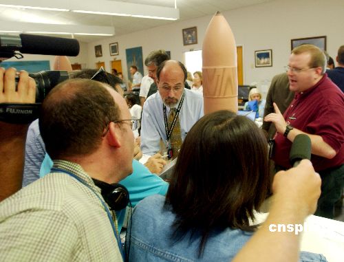 美東部時間七月十三日下午,在肯尼迪航天中心緊急宣布停止發射。記者們立即涌到信息臺前,向現場專家探問究竟。作者:賈國榮