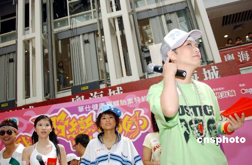 近期在香港熱播的電視劇《我的野蠻奶奶》劇組演員,7月24日在奧海城與觀眾近距離接觸,讓市民一睹眾明星風采。圖為飾演奶奶的汪明荃一身搖滾打扮登臺與觀眾會面玩游戲派“利是”。