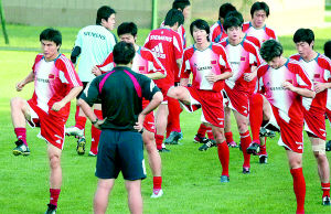 昨天傍晚5時30分開始的近兩個小時的訓練中,朱廣滬拿出40分鐘的時間專門演練前場定位球。由于孫祥感冒沒有參加昨天的訓練,罰角球的任務給了腳法秀麗的陳濤和鄭斌。