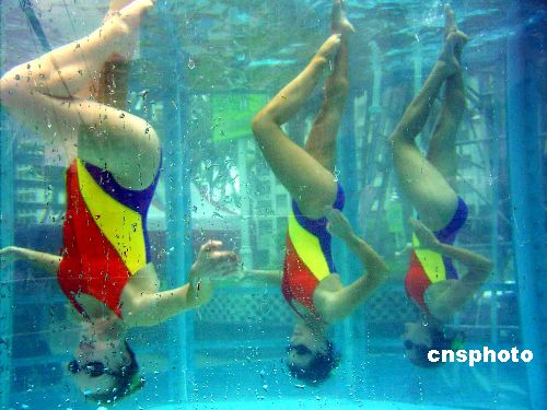 “黃埔夏日跳躍水世界”預演于29日在香港舉行,多位澳洲好手呈獻世界級花式跳水表演。圖為優美花式韻律泳表演。作者:彭兆輝