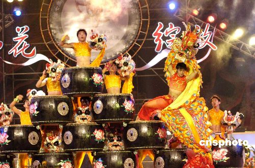第七屆中國民間文藝山花獎·民間藝術表演獎,八月六日晚在廣東東莞樟木頭降下帷幕,云南的《跳菜舞》、廣東湛江的《雷州雄師展英姿》、廣東東莞的《麒麟戲錢鼓》等十個作品獲得優秀作品獎。圖為廣東東莞樟木頭麒麟代表隊在閉幕式上表演他們的獲獎作品《麒麟戲錢鼓》。作者:羅仰明