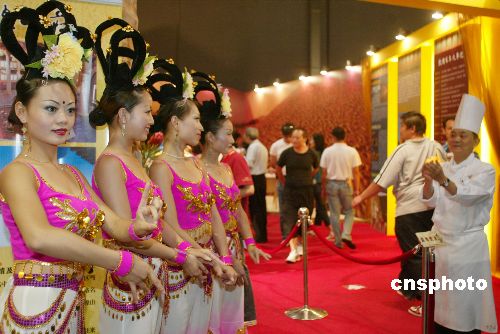八月七日,在臺北世貿(mào)中心進行的二○○五年臺北“中華美食節(jié)”進入最后一天,眾多臺北市民抓住最后一天的時間,到美食節(jié)參觀、品嘗美食,來自甘肅省的敦煌風(fēng)情宴成為美食節(jié)一大亮點,更有“飛天舞女”助興。作者:盛佳鵬