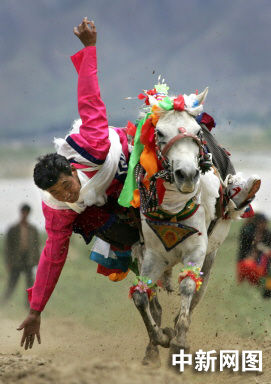 8月7日,西藏牧民在靠進(jìn)拉薩的薩拉鎮(zhèn)(Tsara)騎術(shù)比賽上撿起白色的哈達(dá),展示騎術(shù)。每年豐收時(shí)節(jié),牧民們會聚集在一起,展示他們的騎術(shù)。
