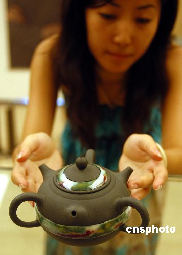 “古藝新生·美人醉再現”----臺灣知名陶藝家陳佐導先生精品陶瓷藝術展將于八月九日至十七日在北京中國美術館舉辦。此次展出的百件陶瓷精品均為陳先生終其一生研究的成果。圖為展出的一款造型獨特、寓意“兩岸三通”的茶壺。作者:張宇