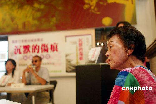八月八日,在抗日戰爭勝利六十周年前夕,臺灣第一本日軍慰安婦歷史影像書《沉默的傷痕》在臺北舉行新書發布儀式,希望藉由本書還原二戰中有關慰安婦的真實歷史。圖為一名慰安婦在發布會現場。作者:盛佳鵬