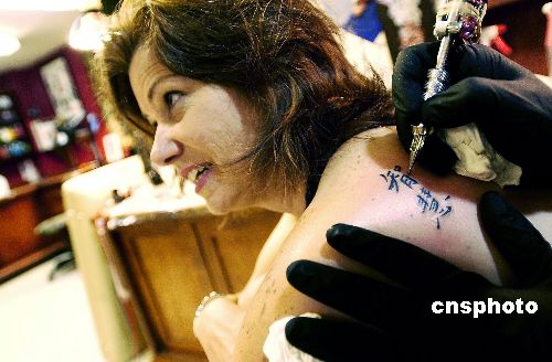 正在功讀心理學博士的美國人帕特麗夏女士八月將迎來四十四歲生日,她送自己一個獨具風格的生日禮物——用漢字“智慧”兩字紋身。紋身在美國多元文化中非常普遍,許多人選擇漢語的詞或字符紋身,是因為漢字的藝術可觀性并且充滿東方神秘感。美國的許多著名演員和歌手都紋身刺字,以此推廣為大眾化藝術。作者:陳鋼
