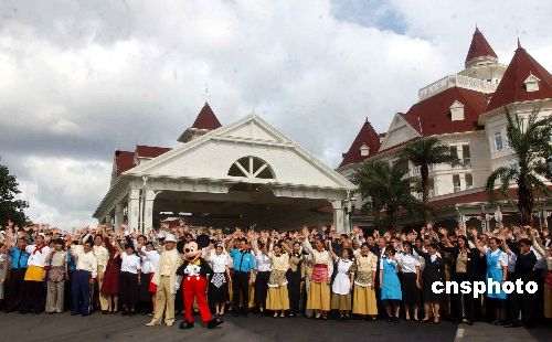 樂園員工在維多亞式建筑為主題的迪斯尼樂園酒店前向傳媒揮手致意。作者:譚達明