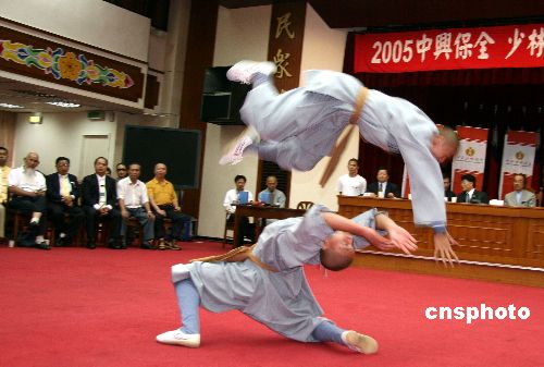 河南嵩山少林武僧團一行十九人抵臺進行武術觀摩交流活動。圖為八月十二日,該團武僧在“立法院”群賢樓舉行的記者會上表演對練,技驚四座。作者:董會峰
