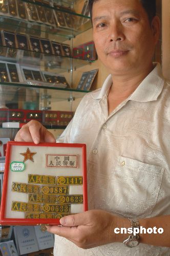 八月十三日,在福州鐵路公安工作二十幾年的揚先生在家里展示收藏的第一代中國人民警察的警銜。楊先生是一位軍銜、警銜的收藏愛好者,至今已經(jīng)收藏有各類軍銜、警銜上千枚,不少都是收藏界的精品。作者:王東明