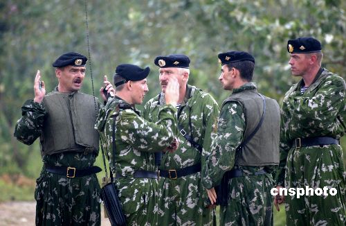 八月二十四日,“和平使命—2005”中俄聯合軍事演習兩棲登陸作戰實兵演練在山東半島如期進行。圖為完成登陸任務后的俄羅斯陸戰隊軍官,交流任務完成情況。作者:王麗南