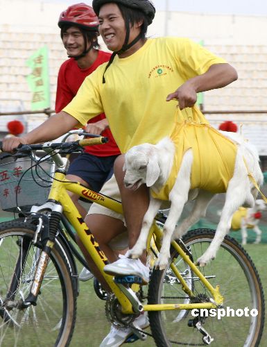 8月26日,“全國首屆自行車叼羊大賽”在山東省棗莊市舉行。比賽規定每次上場的2支參賽隊各派出4名自行車隊員,參賽隊員只有把代表自己隊伍顏色的5只小山羊叼回“羊圈”后,才有權去叼那只“公共羊”,最先叼回“公共羊”的代表隊獲勝。這次共有10支自行車代表隊參加了角逐比賽。作者:吉喆