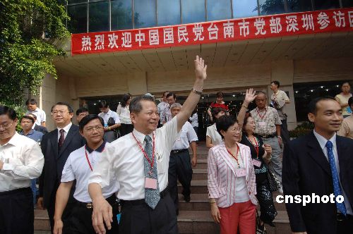 八月二十八日上午,由莊松旺主委率領的中國國民黨臺南市黨部參訪團一行來到深圳南嶺村社區居委會、大芬油畫村、布吉農產品批發市場參觀。圖為中國國民黨臺南市黨部主委莊松旺向深圳南嶺村社區居民揮手致意。作者:聞子