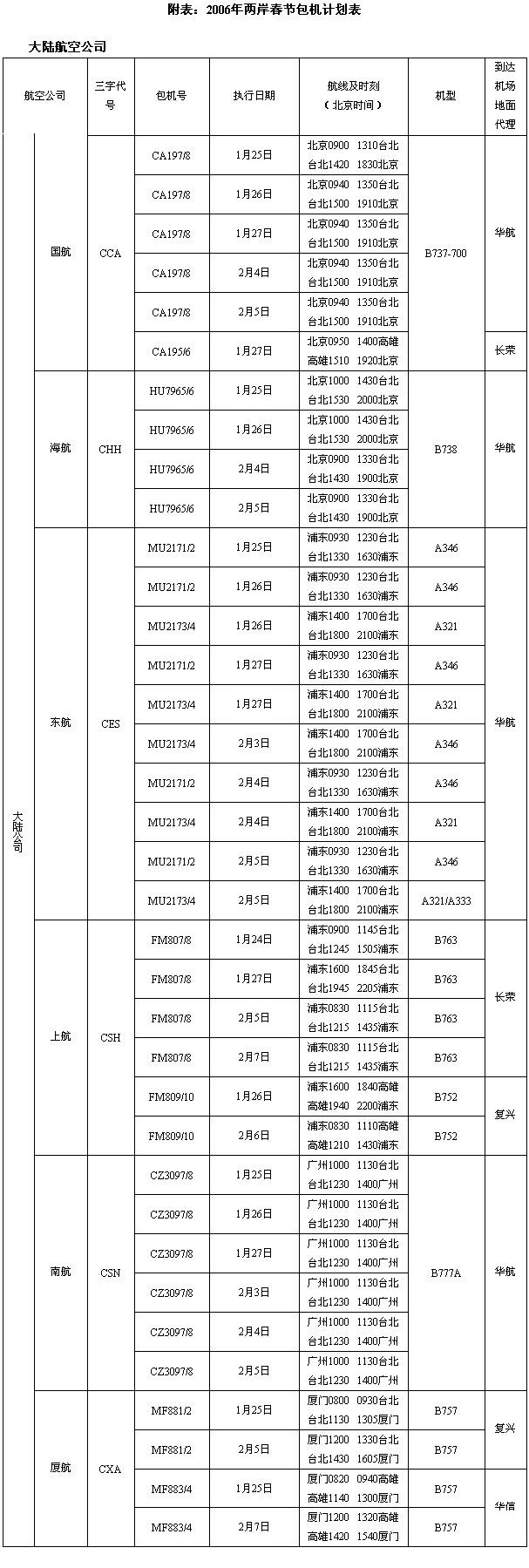 中新網1月10日電 來自中國臺灣網的消息,今年兩岸春節包機航班已經正式確定。其中,臺灣將由華航、長榮、華信、立榮、復興及遠東六家航空公司執行航務;大陸方面則由中國國際航空股份有限公司、東方航空股份有限公司、南方航空股份有限公司、上海航空股份有限公司、廈門航空有限公司、海南航空股份有限公司執行飛行任務。
