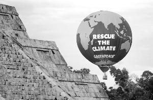 28日,在墨西哥坎昆的奇琴伊查瑪雅古城遺址旁,綠色和平組織升起一個巨大的熱氣球,呼吁人們保護環境 新華社圖