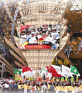 何鴻燊在首名火炬手手中接過火炬后,即在圣火護(hù)衛(wèi)隊(duì)簇?fù)硐虏角埃泄?jié)奏地跑起來,而大批記者均撲前拍照,鎂光燈閃個(gè)不停,兩旁市民不斷歡呼,令何鴻燊精神抖擻地完成了200米的傳遞路程,將火炬交到第3名火炬手手上。