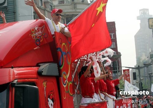 五月二十三日,奧運圣火在上海傳遞,老外在奧運花車上振臂為北京奧運加油。 中新社發 潘索菲 攝