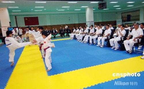 7月14日,29名將執(zhí)法北京奧運會的裁判員聚集在北京什剎海體校跆拳道訓練館,參加由世界跆拳道聯(lián)盟組織的奧運前的“最后一課”。這也是世跆聯(lián)第一次在東道主國家舉辦奧運前最后一次裁判培訓班。圖為裁判員觀看什剎海體校跆拳道運動員表演。 中新社發(fā) 王東明 攝