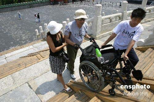 2008年7月15日,一位有腿疾的外國游客在他人的幫助下登上無障礙臺階。為迎接奧運會及殘奧會,方便殘疾游客,北京天壇公園首次在祈年殿東側臺階搭建無障礙設施,搭建工作于近日完成。中新社發 魯谷 攝