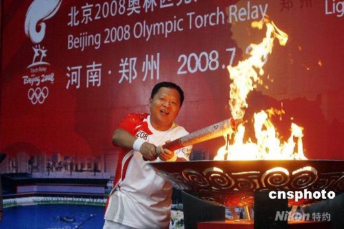 7月25日,中國工程院院士、中國信息與通信工程專家、解放軍信息工程大學校長鄔江興點燃圣火盆,奧運火炬在鄭州的傳遞正式結束。 中新社發 慎重 攝