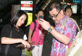 高金素梅率團體前往北京參加北京奧運表演彩排,在機場巧遇唱片制作人李宗盛(右),兩人互動熱絡,相約北京見。 “中央社”圖