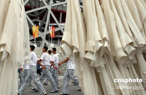 演員和服裝道具提前進入場內。 中新社發 杜洋 攝