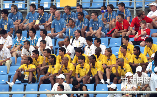 8月6日,北京奧運會沈陽足球分賽場女足預賽,巴西對德國0:0戰平。圖為巴西男足隊員觀看比賽。 中新社記者 張宇 攝