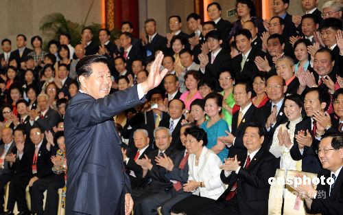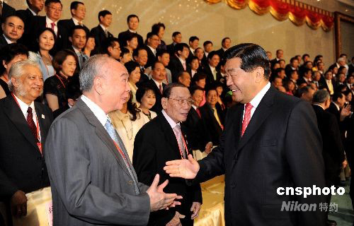 8月8日,中共中央政治局常委、全國政協主席賈慶林在北京釣魚臺國賓館會見出席北京奧運開幕式的近200位華人華僑代表。中新社發 廖攀 攝