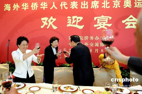 8月8日,中國國務(wù)院僑務(wù)辦公室在北京釣魚臺國賓館舉行宴會,歡迎出席北京奧運(yùn)開幕式的近200位華人華僑代表。中新社發(fā) 廖攀 攝