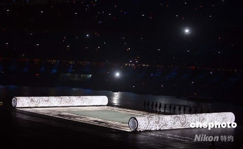 8月8日晚,第二十九屆奧林匹克運動會在北京開幕。由中國著名電影導演張藝謀指導的北京奧運會開幕式文藝演出節目中的核心部分——《美麗的奧林匹克》,全部內容圍繞一幅“中國古代畫卷”卷軸的開啟展開。中新社發 任晨鳴 攝