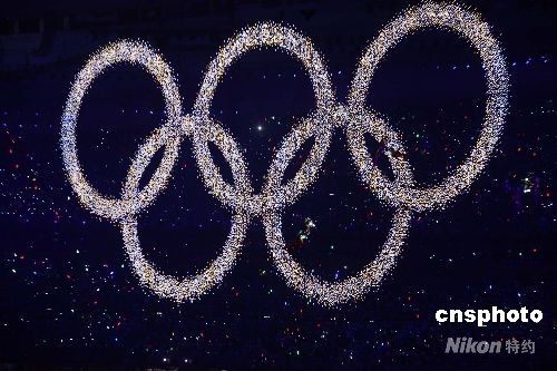 8月8日晚8時(shí)8分,第二十九屆夏季奧運(yùn)會在北京的國家體育場--鳥巢隆重開幕。五環(huán)圖案在北京“鳥巢”內(nèi)閃耀。中新社發(fā) 任晨鳴 攝