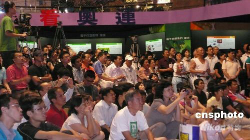 八月八日,舉世矚目的北京奧運會壯麗登場,成千上萬的臺灣民眾在家中、餐館或街頭大屏幕下,準時收看晚八時零八分開始的奧運開幕式。有媒體形容這是一場“視聽饗宴”。圖為臺北市京華城購物中心內,民眾席地而坐觀看開幕演出。中新社發 曾嘉 攝