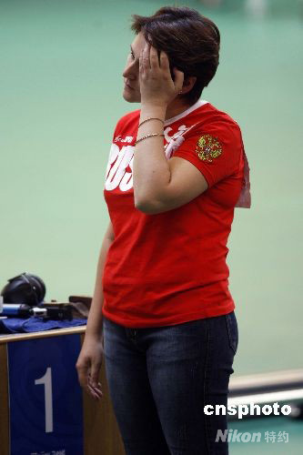 8月10日,在北京奧運會女子10米氣手槍決賽中,中國選手郭文珺奪得冠軍,并以492.3環的成績打破奧運會紀錄,俄羅斯名將帕杰琳娜獲得亞軍。圖為帕杰琳娜在比賽結束后失落的神情。 中新社發 盛佳鵬 攝