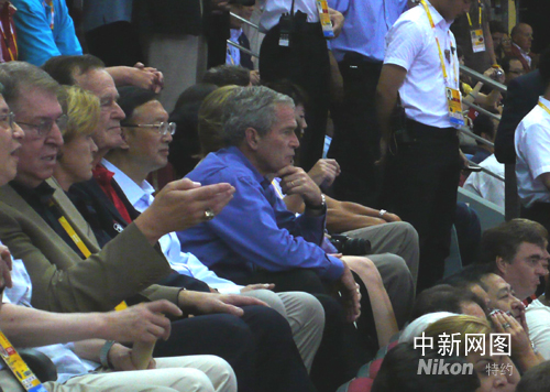 美國總統(tǒng)布什和家人在中國外長楊潔篪的陪同下,在五棵松籃球館觀看比賽。中新社記者 宋方燦 攝