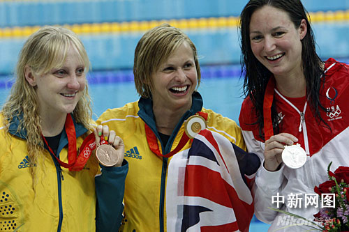 8月11日,北京奧運(yùn)會(huì)女子100米蝶泳決賽,澳大利亞選手莉斯貝絲·特里克特以56秒73獲得金牌。中新社發(fā) 杜洋 攝