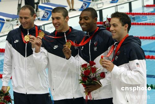 8月11日,美國隊奪得北京奧運會男子4x100米自由泳接力金牌,并打破該項目世界紀錄。 中新社發 杜洋 攝