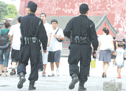 8月11日,幾名特警在故宮的端門和午門景點佩槍巡邏,保護中外游客人身安全。吳長青攝