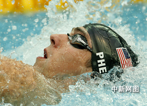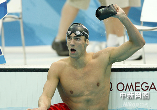 8月15日上午,在國家游泳中心水立方舉行的北京奧運會男子200米混合泳中,美國選手菲爾普斯續寫神話,以1分54秒23的成績打破由他自己保持的1分54秒80的世界紀錄,收取他在本屆奧運會的第6枚金牌,也是他奪取的奧運會第12塊金牌。中新社發 杜洋 攝