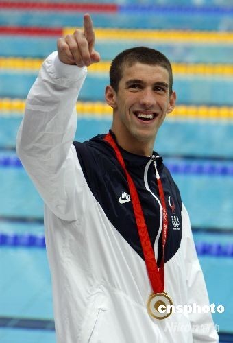 8月15日上午,在國家游泳中心水立方舉行的北京奧運會男子200米混合泳中,美國選手菲爾普斯續寫神話,再次打破世界紀錄獲得冠軍,收取他在本屆奧運的第六枚金牌,使得他在奧運會上獲得的金牌總數達到12枚。中新社發 杜洋 攝