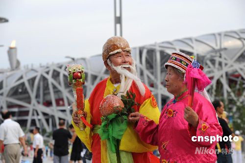 8月16日,北京奧林匹克公園,來自石家莊的民眾穿著中國壽星裝束游覽奧林匹克公園。中新社發 廖攀 攝