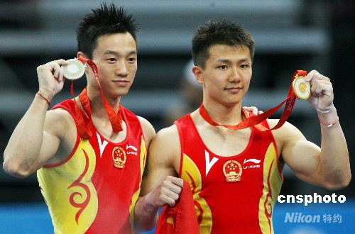 8月18日,中國選手陳一冰(右)在北京奧運會男子吊環決賽中以16.6分的成績奪得金牌,另一位中國選手楊威獲得銀牌。 中新社發 武仲林 攝