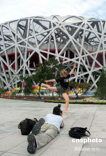 8月18日,一位德國體操小選手在“鳥巢”前“熱舞”,并留下倩影。 中新社發(fā) 許曉青 攝