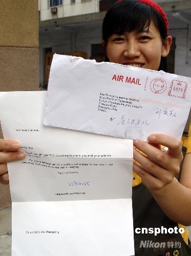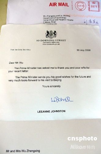 圖:英國首相布朗回函中國“奧運夫婦”
