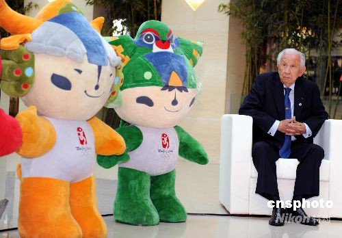 8月21日,國(guó)際奧委會(huì)終身名譽(yù)主席薩馬蘭奇攜手福娃在北京奧林匹克公園展示中心參加活動(dòng)。中新社發(fā) 王東明 攝