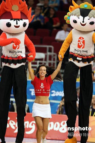 北京奧運會男子籃球半決賽8月22日晚在五棵松籃球館開戰,深受各國觀眾喜愛的北京奧運會吉祥物“福娃”表演踩高蹺為比賽助陣。中新社發 任晨鳴 攝