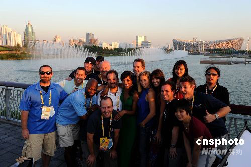 北京奧運接近尾聲,美國NBC電視臺等媒體記者合影留念惜別奧林匹克公園。中新社發 廖攀 攝