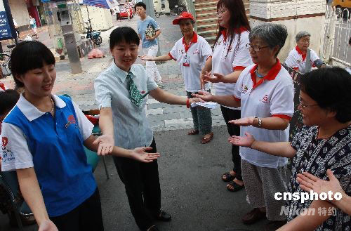 9月3日,北京市民在東四郵局門口與志愿者們一起學習手語“北京歡迎你”,迎接即將來臨的殘奧盛會。這一天,是北京殘奧會志愿服務的行動日。中新社發 鄭雄增 攝
