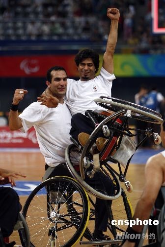 9月7日,北京殘奧會輪椅籃球首日比賽中,伊朗隊以73比62的比分戰勝南非隊。中新社發 杜洋 攝