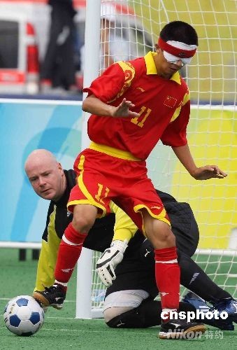 9月7日中午,北京殘奧會五人制(男子)足球小組賽在北京奧林匹克公園內的曲棍球場舉行,中國隊以絕對優勢3比0擊敗英國隊。殘奧會五人制(男子)足球賽的參賽隊由四名盲人球員與一名非盲人守門員組成,盲人球員全憑刻苦的訓練與對足球的感覺在場上尋找攻破對方大門的機會。中新社發 任晨鳴 攝